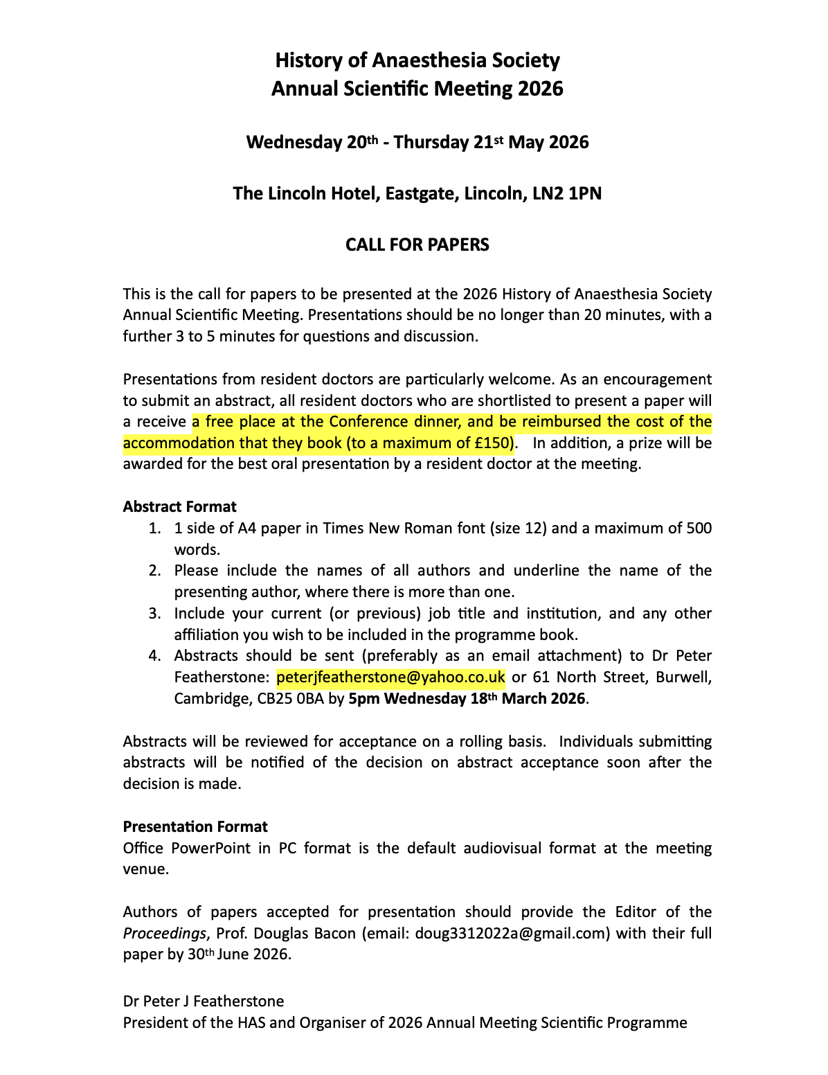 History of Anaesthesia Society Annual Scientific Meeting 2026 - Lincoln **CALL FOR PAPERS ** We are now accepting submissions for papers for this meeting which will be held on 20th and 21st May 2026 at The Lincoln Hotel, Eastgate, Lincoln LN2 1PN . Presentations from resident doctors are particularly welcome and for the second year running there will be a prize for best presentation from a resident. Abstracts should be sent to HAS President Peter Featherstone on peterjfeatherstone@yahoo.co.uk . Further details can be found below:
